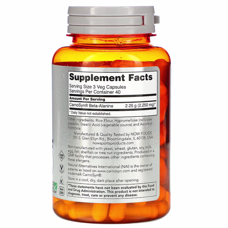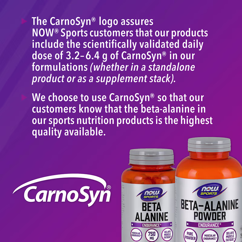 Beta-Alanine is a non-essential amino acid that is used by muscle cells to synthesise Carnosine. Carnosine is a dipeptide (Beta-Alanine plus Histidine) that functions as a buffer for the hydrogen ions (acid) produced during strenuous exercise, thus helping to maintain optimum muscular pH. NOW Sports uses CarnoSyn®, a patented form of Beta-Alanine that has been clinically tested and shown to increase muscle Carnosine content, allowing muscles to work harder and longer during intense exercise. NOW® Sports Beta-Alanine is backed by scientific research demonstrating that CarnoSyn® supplementation results in delayed muscle fatigue and rapid recovery time, thereby helping you attain your strength and endurance training goals.