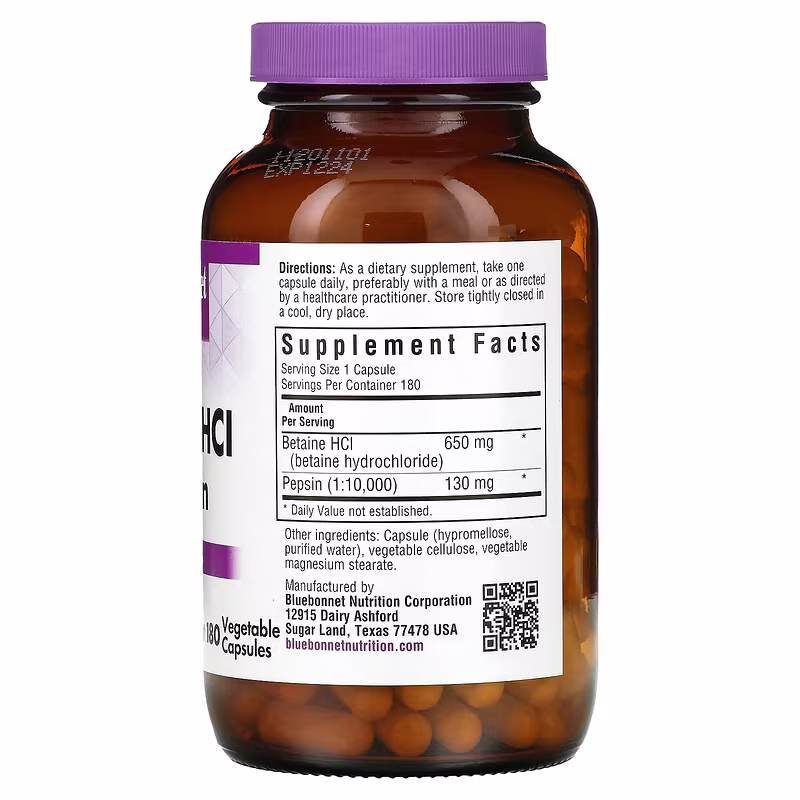 Bluebonnet’s Betaine HCl & Pepsin Vegetable Capsules are formulated with a special combination of betaine hydrochloride and pepsin, a digestive enzyme to help support the digestive process.