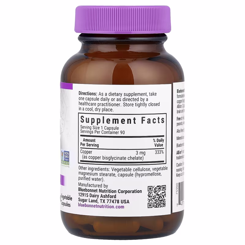 Bluebonnet’s Chelated Copper Vegetable Capsules are formulated with 3 mg of elemental copper from fully reacted copper bisglycinate, an amino acid chelate mineral from Albion. Copper is an essential element that is necessary for the nervous system and immune health.