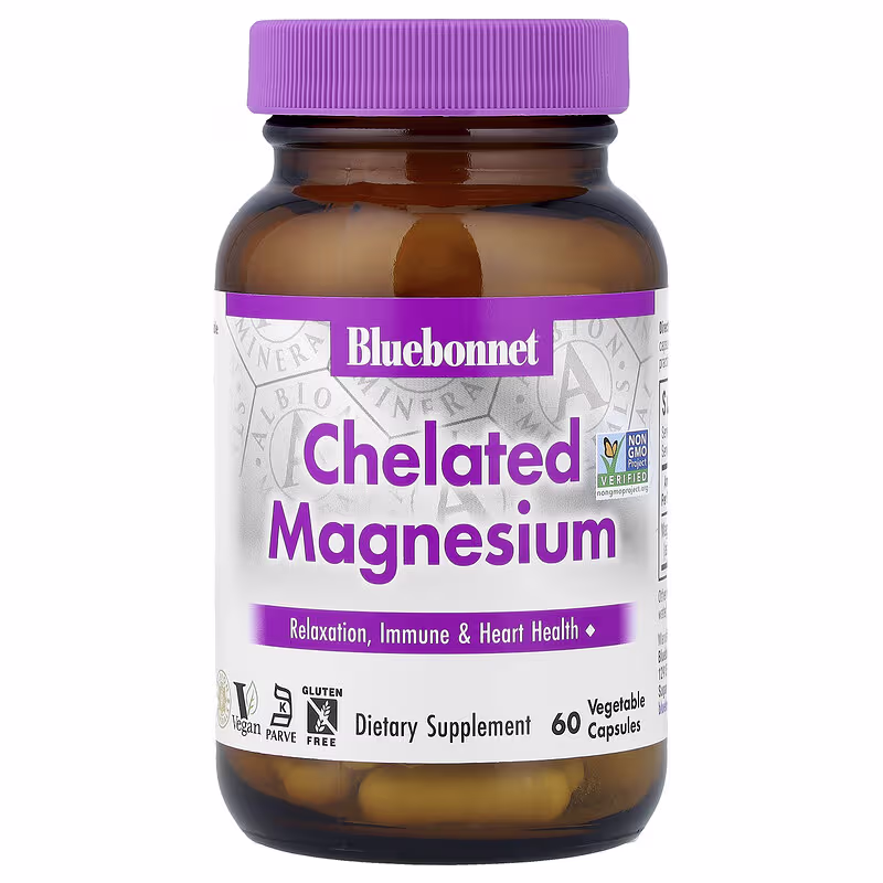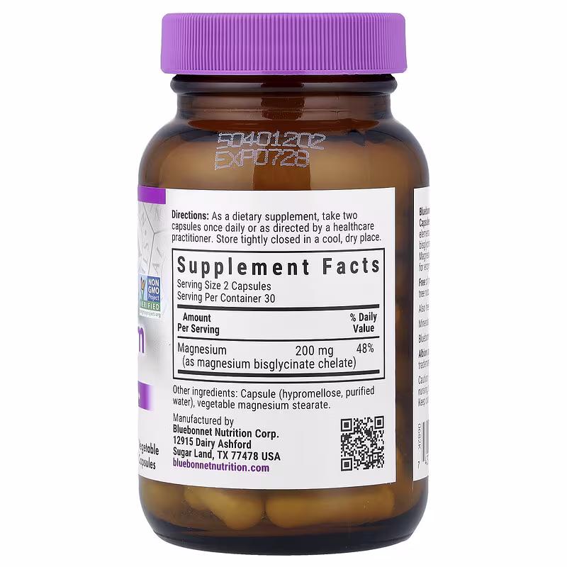 Bluebonnet’s Chelated Magnesium Bisglycinate Veg Capsules are formulated with 200 mg per serving of elemental magnesium from fully reacted magnesium bisglycinate, an amino acid chelate mineral from Albion. Magnesium supports energy production and is critical for enzyme function.