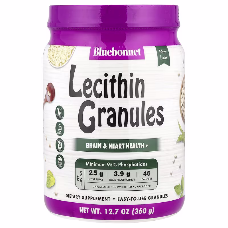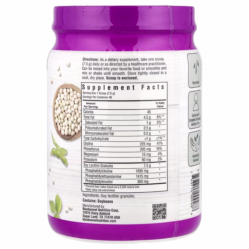 Bluebonnet’s Lecithin Granules are sourced from non-GMO, identity-preserved (IP) soybeans grown and sustainably harvested in the UK and Canada at their nutritional peak to ensure quality and maximum nutritional density. Each scoop delivers plant-based, daily nutritional support for energy, vitality, brain, and heart health. Just clean, simple, nutritious lecithin.