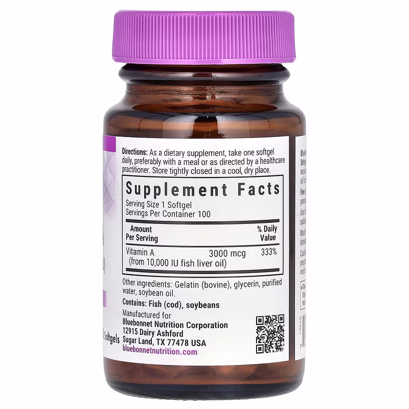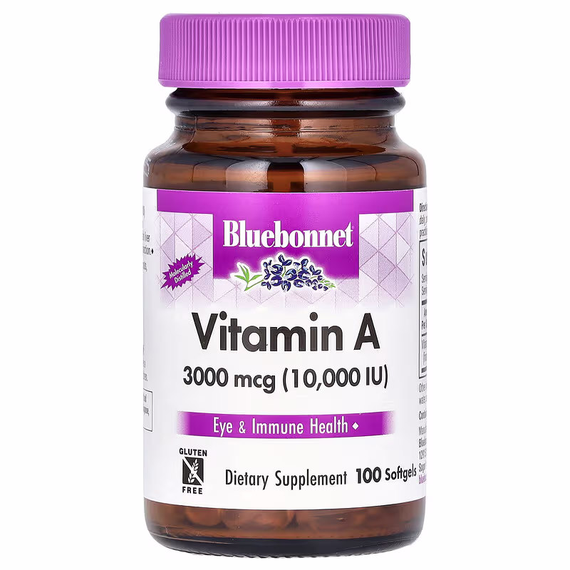 Bluebonnet’s Vitamin A 3000 mcg (10,000 IU) Softgels are formulated with vitamin A from molecularly distilled, deep sea, cold water fish liver oil to help support eye health and immune function.