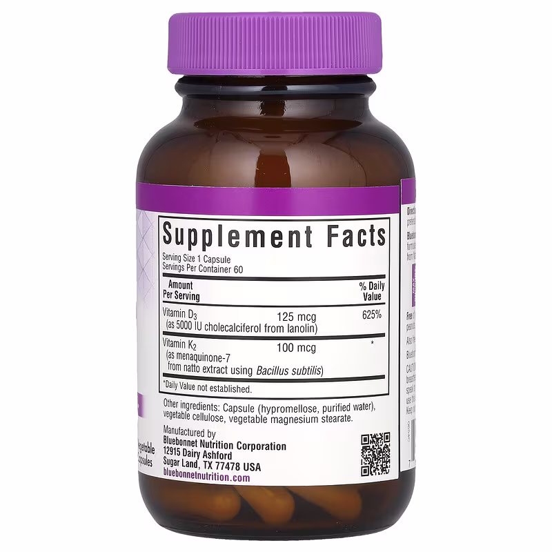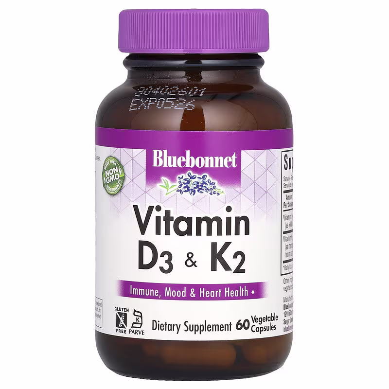 Bluebonnet’s Vitamin D3 & K2 Vegetable Capsules are formulated with vitamin D3 (cholecalciferol) and K2 (MK-7) from Natto.