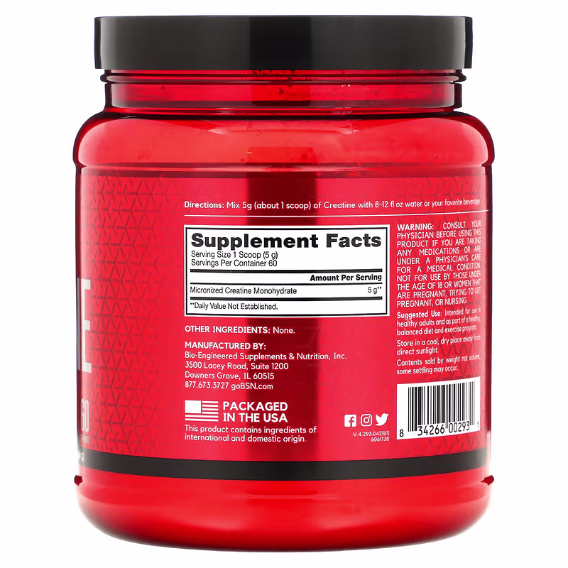 BSN® Creatine provides 5 grams of pure micronized Creatine Monohydrate to support strength, power, and muscle building without any fillers or additives *. With unflavored versatility, BSN® Creatine may be added to your post-workout recovery shake or favorite beverage.