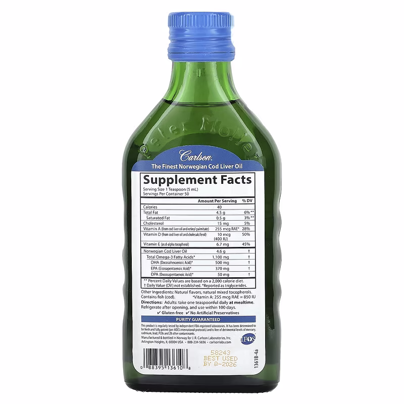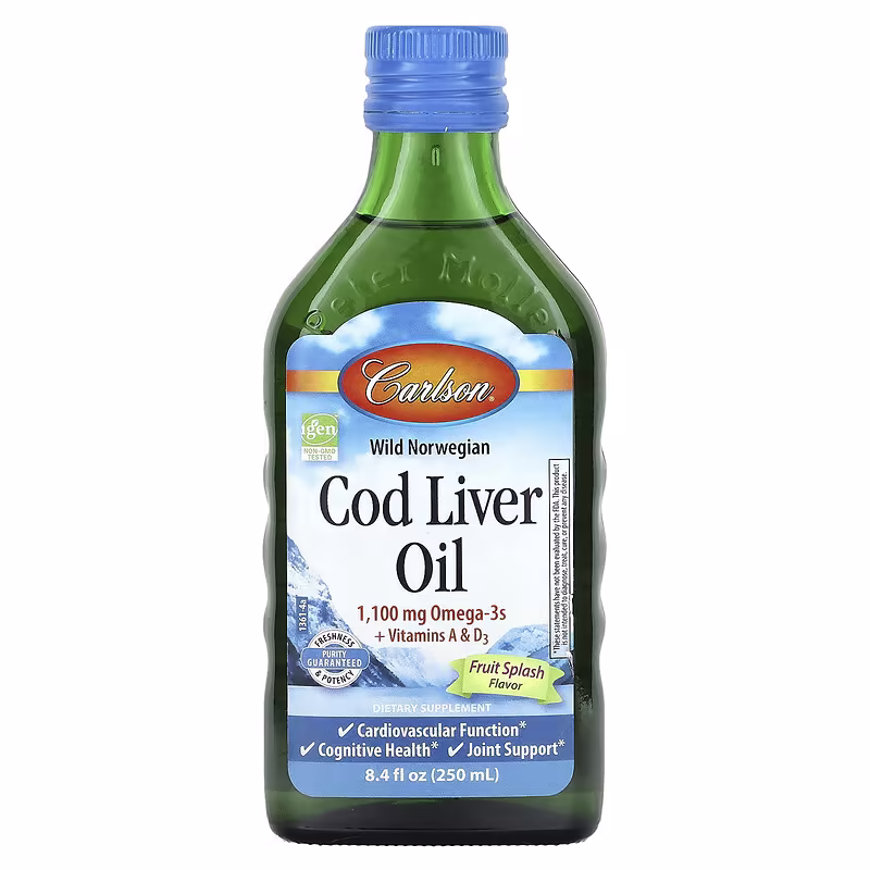 Carlson Cod Liver Oil has received numerous awards for its taste and quality. A single teaspoonful provides 1,100 mg of omega-3s, including EPA and DHA, which support heart, brain, vision, and joint health. To ensure maximum freshness, Cod Liver Oil is closely managed from sea to store.