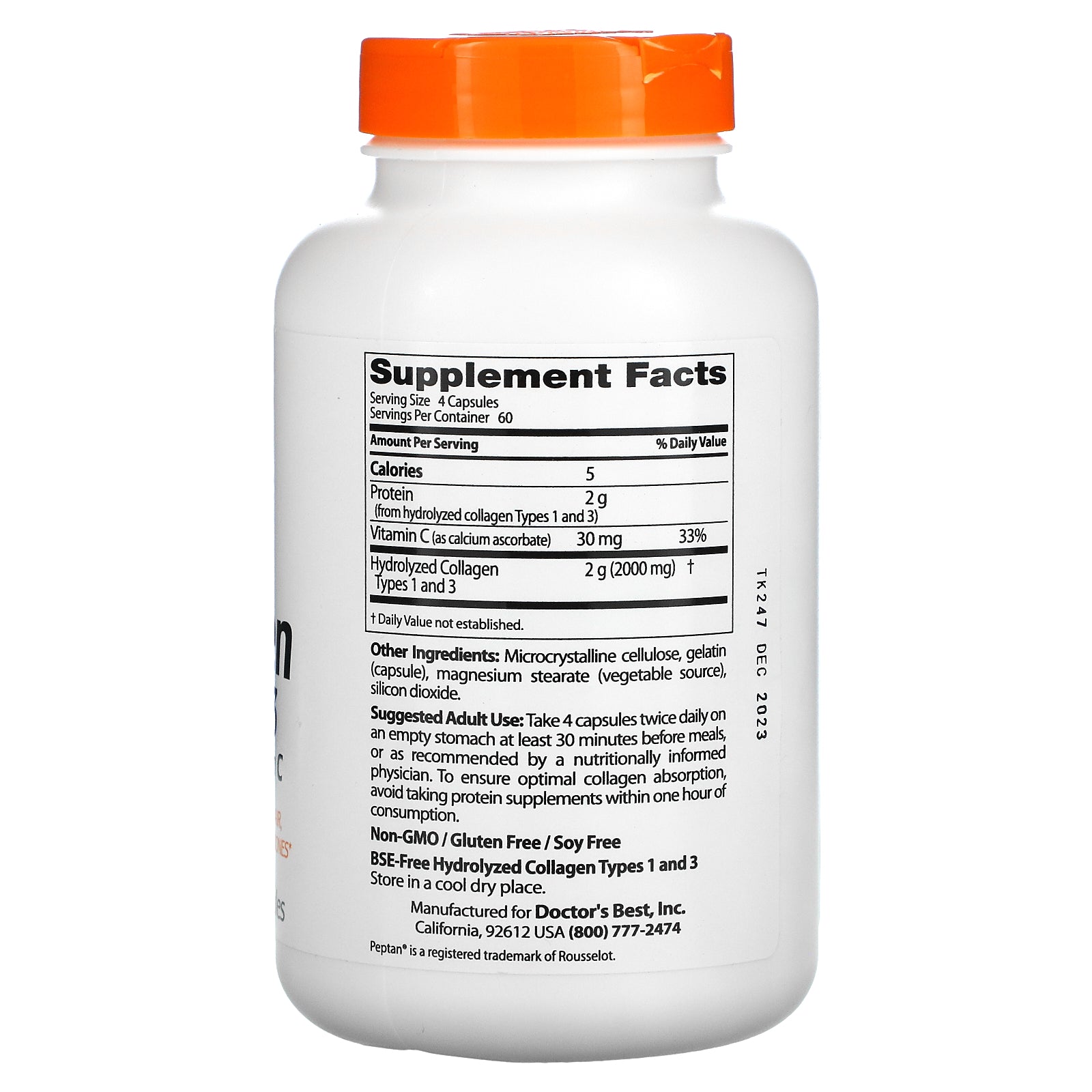 Doctor’s Best Collagen Types 1 and 3 contains hydrolyzed collagen protein (BSE-Free), which contributes to the growth and maintenance of healthy tissues. Collagen is the structural protein essential for the strength of bones and flexibility of joints, tendons, ligaments, hair, skin, nails, and other tissues throughout the body. Vitamin C is added to the formula as an important nutrient required for collagen synthesis by the body.