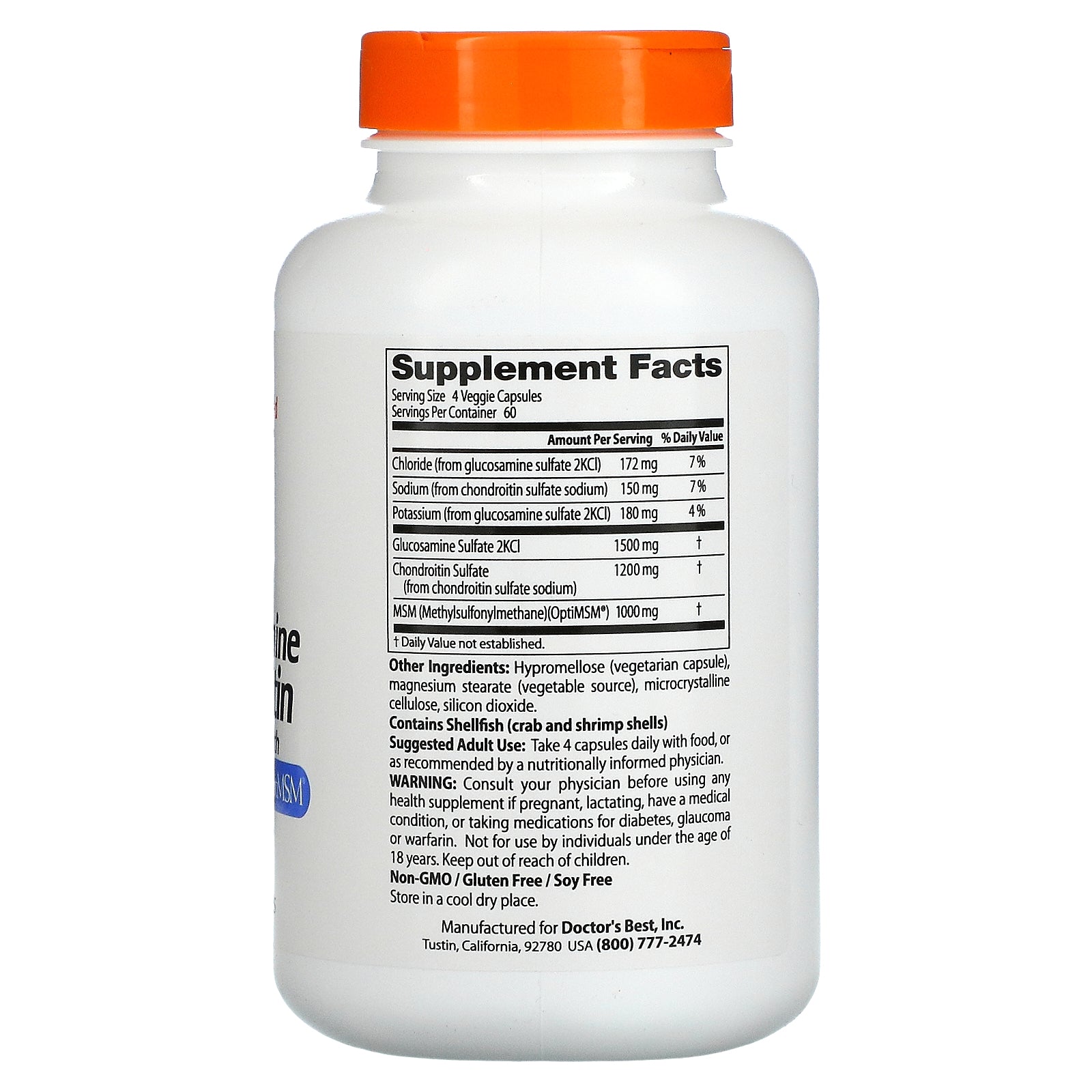 Doctor’s Best Glucosamine Chondroitin MSM provides three important nutrients to support healthy joints and connective tissues: glucosamine, chondroitin and Methylsulfonylmethane (MSM, from OptiMSM®).