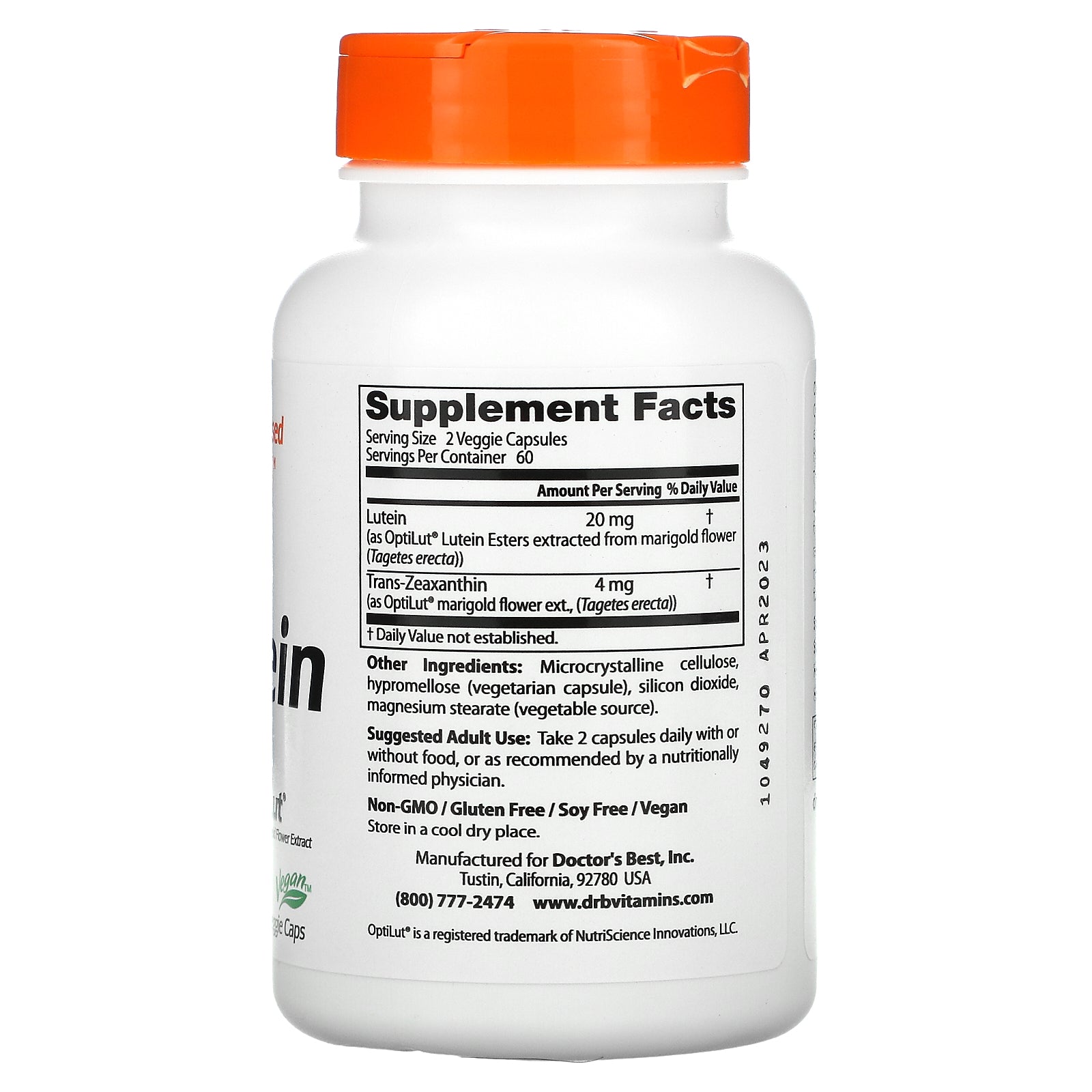 Doctor’s Best Lutein with OptiLut® supplies OptiLut® which is produced under a patented extraction process from Marigold flowers, and contains highly bioavailable all natural Lutein and Trans-Zeaxanthin.