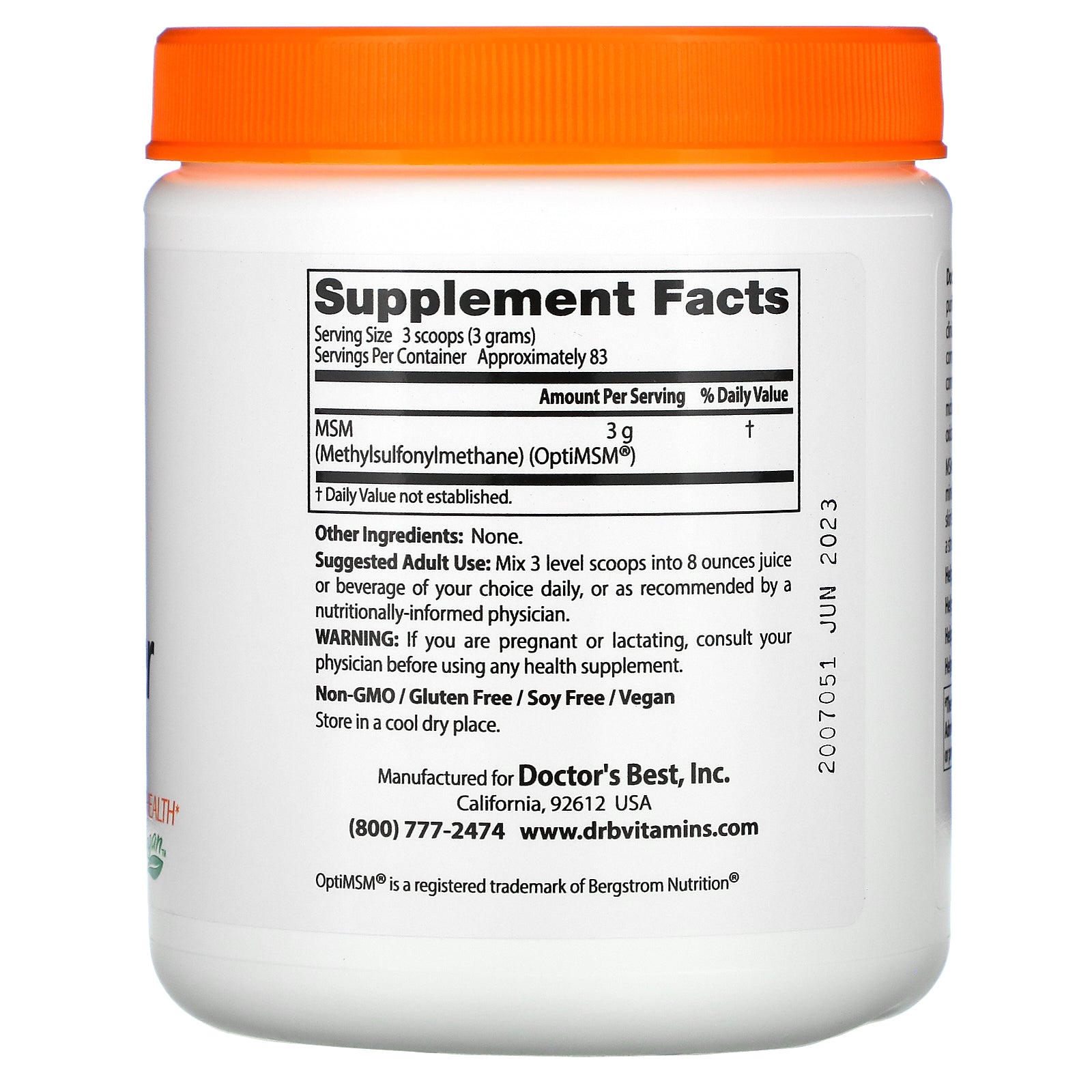 This product contains a high quality MSM (methylsulfonylmethane) backed by numerous clinical studies. MSM helps support the formation of healthy connective tissues, overall joint health, and mobility.