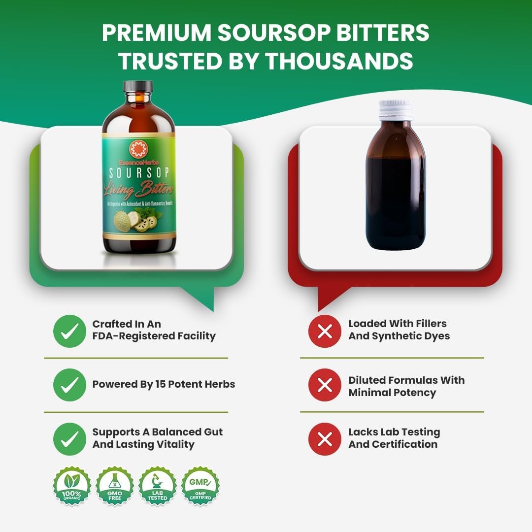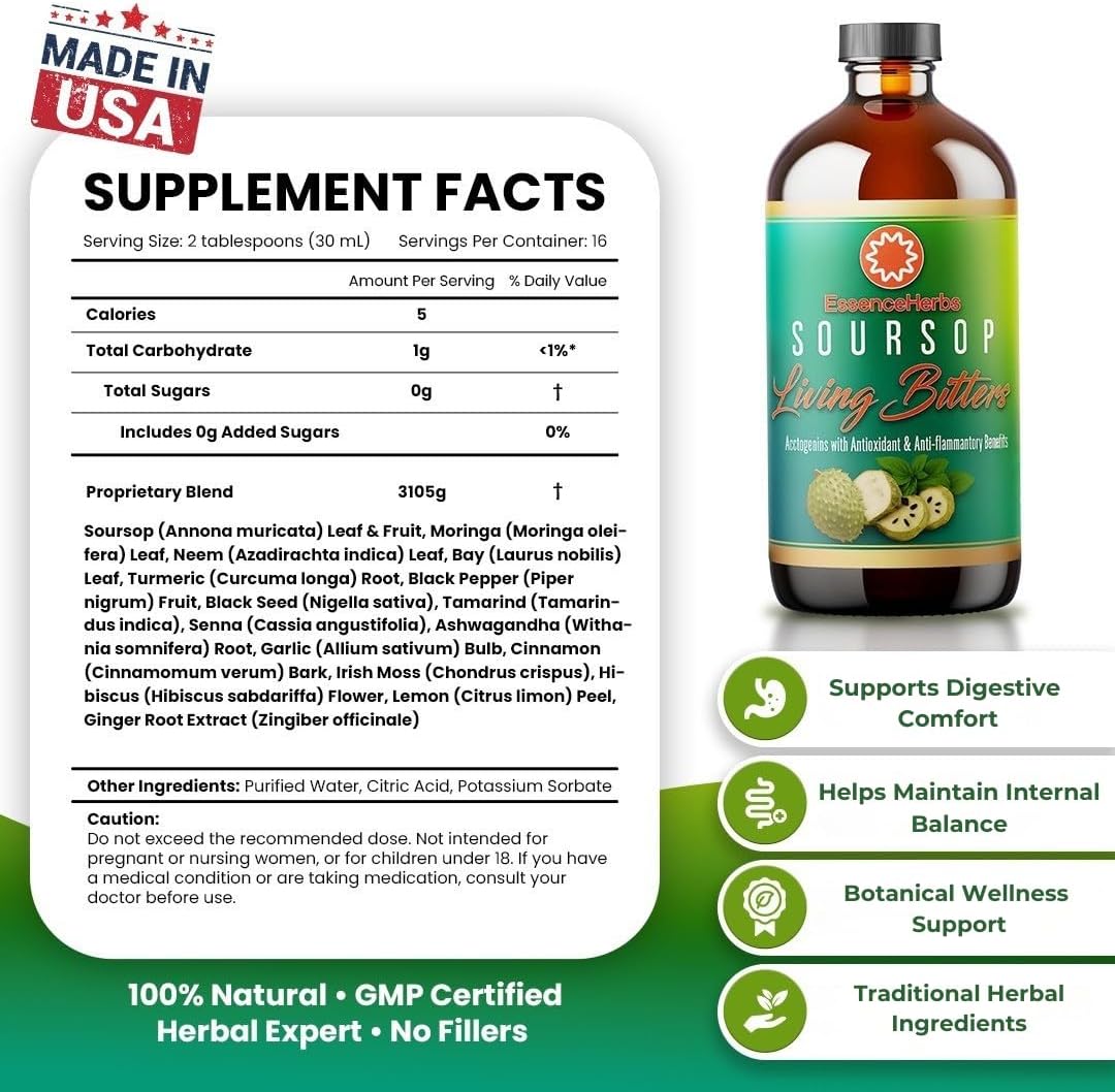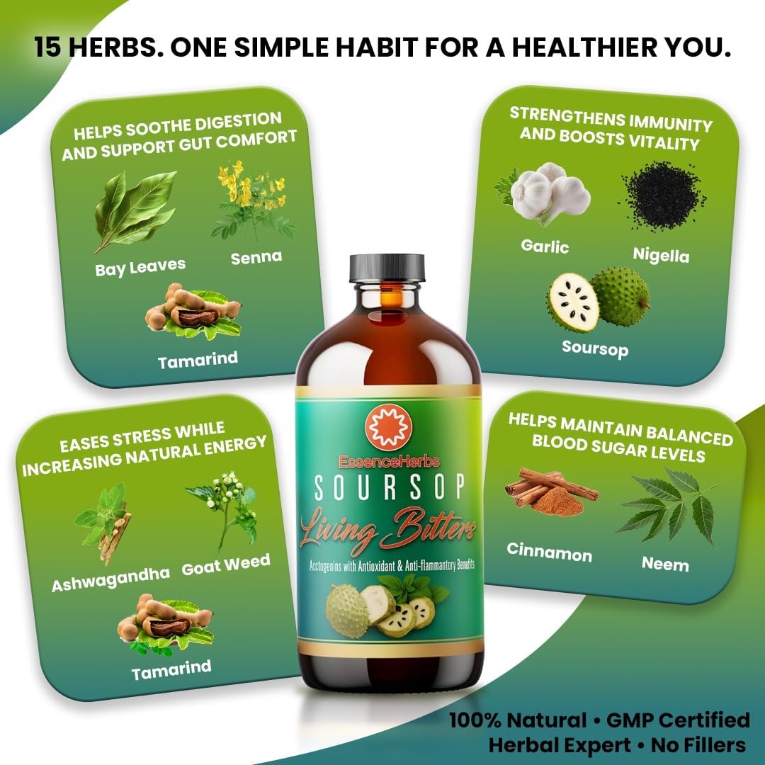 15-HERB SOURSOP LIVING BITTERS FORMULA – Our soursop bitter liquid is crafted with soursop (guanabana) leaf, moringa, black seed, neem, turmeric, ginger, ashwagandha, senna, irish moss, cinnamon, garlic, and more for a well-rounded herbal supplement designed to support everyday wellness.