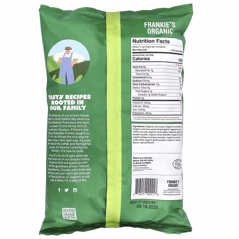 Organic cornmeal, organic avocado oil, organic chili lime seasoning (organic tapioca syrup solids, sea salt, organic cane sugar, organic green bell pepper powder, organic onion powder, organic spices, organic jalapeno pepper powder, organic parsley, malic acid, organic garlic powder, organic natural flavor, natural flavor).