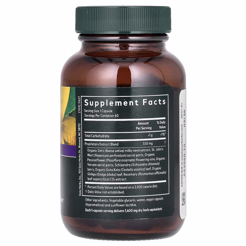 | Organic Oats (Avena sativa) milky seed extract, St. John’s Wort (Hypericum perforatum) aerial parts, Organic Passionflower (Passiflora incarnata) flowering vine, Organic Vervain aerial parts, Schisandra (Schisandra chinensis) berry, Organic Gotu Kola (Centella asiatica) leaf, Organic Ginkgo  (Ginkgo biloba) leaf,  Rosemary (Rosmarinus officinalis) leaf supercritical CO2 extract | ||