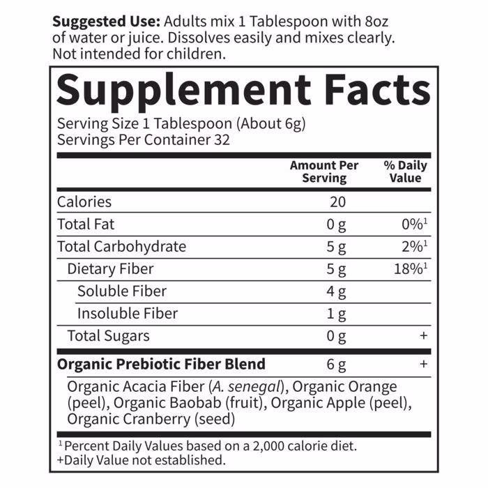 • 5g of prebiotic fiber from 5 nutritious organic superfoods: Organic Acacia, Organic Orange Peel, Organic Baobab Fruit, Organic Apple Peel and Organic Cranberry Fruit