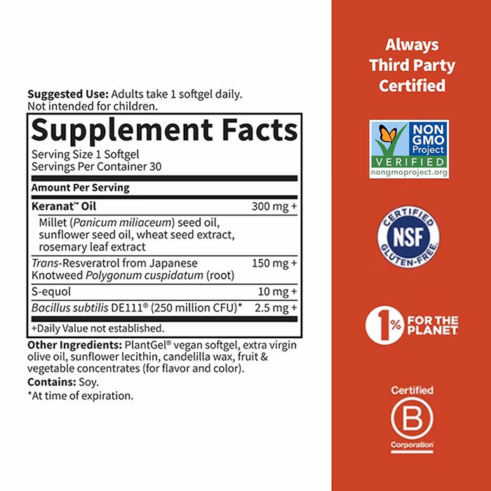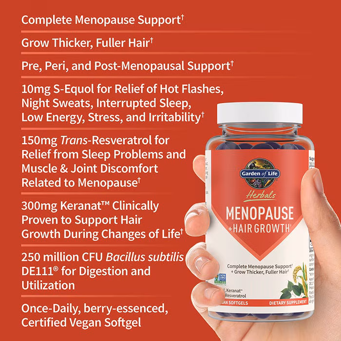 A fulfilling life goes through many stages, and Garden of Life Herbals Menopause + Hair Growth† is here to make THIS stage your best one yet. Containing 10mg of S-equol, a powerful ingredient clinically shown to help relieve hot flashes, night sweats, interrupted sleep cycles, low energy, and stress and irritability†, and 150mg of Trans-resveratrol, an ingredient clinically shown to relieve sleep issues plus muscle and joint discomfort that’s associated with menopause†, this herbal powerhouse can address some of your most disruptive menopause challenges. To help with scalp health and hair loss—an ongoing problem for many women experiencing menopause†—we’ve added 300mg of Keranatâ„¢, a patented extract from millet which has been clinically shown to significantly slow hair loss, reduce scalp dryness, and promote healthier, shinier, and more lustrous hair during 12 weeks of continual use.†  All of these ingredients for menopause support are offered in just one Non-GMO Verified, berry-essence softgel per day.â€