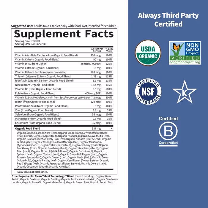 Over 30 Certified Organic fruits, veggies & herbs loaded with vitamins and minerals