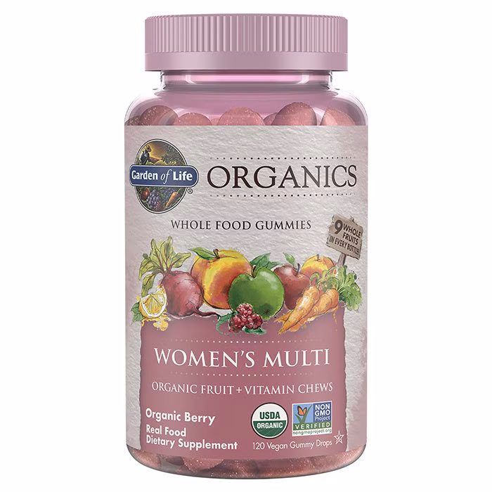 Garden of Life Organics Women’s Multi Gummies are Certified USDA Organic and Non-GMO Project Verified fruit and vitamin gummies. Made with nine organic whole fruits in every bottle—no synthetic vitamins—Garden of Life Organics Women’s Multi Gummies come in a great-tasting organic berry chew made with pectin from non-GMO apples and organic orange peel—no pig gelatin.