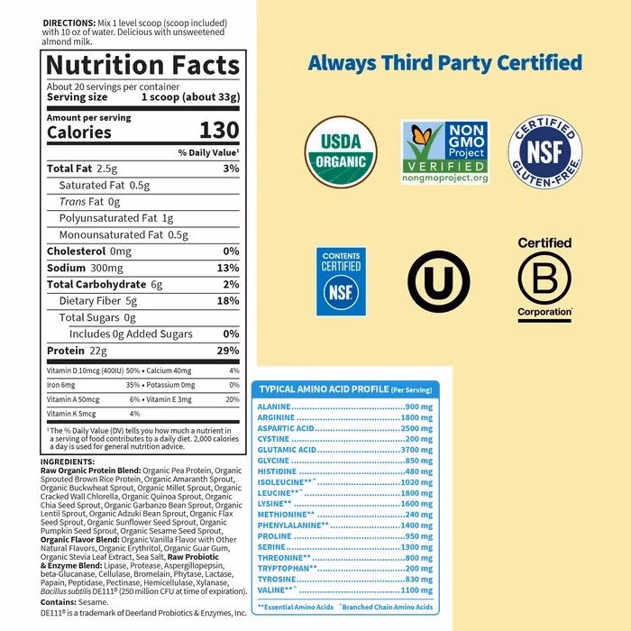 Made with 14 raw sprouted proteins, delivering 22 grams of complete plant-based protein
