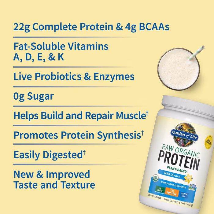 If you’re looking for an organic protein powder that’s full of goodness plus tastes great, you’re in the right place! Raw Organic Vanilla Protein powder has a new and improved taste and texture that you’re going to love! Raw Organic Protein, Vanilla is made with organic peas, sprouted grains, seeds and legumes, delivering 22 grams of clean protein with a complete profile of all the essential amino acids. Raw Organic Protein delivers vitamins A, D, E and K and supports digestive health and function with probiotics and protein-digesting enzymes.† Raw matters because heat can denature proteins, reducing their availability to your body. But Garden of Life’s Certified Organic plant proteins are different—always gently produced at low temperatures, without any added fillers or carriers, preserving their complete amino acid integrity and whole-food, Certified Organic, Non-GMO goodness. Easily digested, Raw Organic Protein powder mixes well with just water, or you may prefer almond milk or oat milk—the choice is yours. But any way you use it, you’ll be getting an excellent source of complete protein to fuel your body. Raw Organic Protein powder—an excellent source of Certified USDA Organic, Non-GMO Verified, NSF Contents Certified, raw, vegan complete protein powder from raw and organic sprouts.