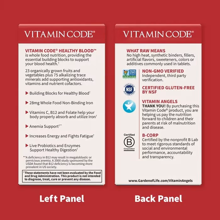 You may not be getting enough blood builders from your diet alone—especially if you are vegan or vegetarian. Gentle on your stomach, Vitamin Code Healthy Blood is whole food nutrition, providing the essential building blocks to support blood health.† Vitamin Code Healthy Blood offers 28mg of gentle, non-binding iron as well as vitamins B-12, C and folate to help your body properly absorb and utilize iron.† The 23 organically grown fruits and vegetables plus 75 alkalizing trace minerals add supporting antioxidants, vitamins and nutrient cofactors. Containing no synthetic binders or fillers, artificial flavors, sweeteners, or additives commonly used in capsules, Vitamin Code Healthy Blood is Non-GMO Project Verified, Certified NSF Gluten Free, and Certified Star K Kosher.