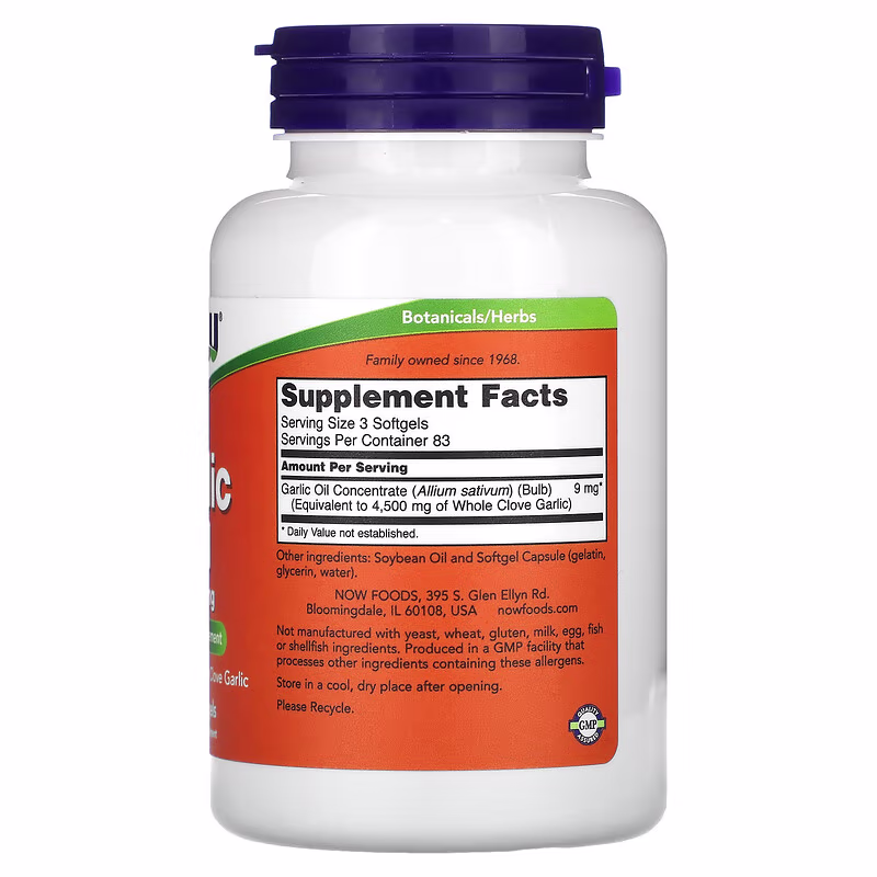 NOW’s® Garlic Oil is extracted and concentrated from the bulb Allium sativum. It is equivalent to a whole garlic clove with no added fillers. Garlic abounds with naturally occurring sulphur compounds, amino acids and trace minerals.