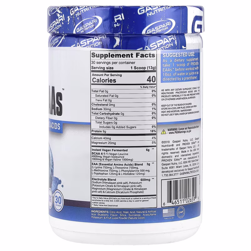 Gaspari’s Proven EAAs provide 9 grams of the full spectrum of all essential amino acids, including 6 grams of vegan fermented BCAAs in a scientifically supported Leucine heavy ratio of 4:1:1, to maximize muscle growth and recovery. Each serving is loaded with Vegan friendly EAAs in an electrolyte matrix powered by pink Himalayan salt, making Gaspari’s Proven EAAs ideal for muscle blasting pre, intra or post workout supplementation.