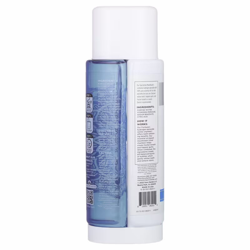 Our Dual Action Mouthwash combines hydrogen peroxide with 100% pure essential oils for safe and effective oral care. Discover whiter teeth, happier gums, and fresher breath in a swish.