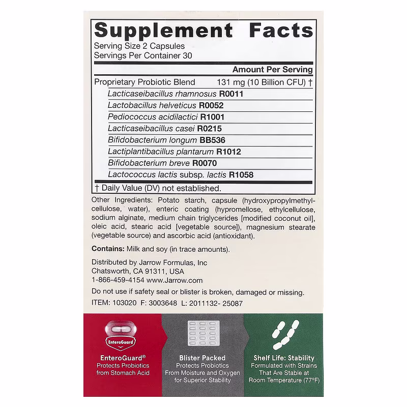 | Proprietary Probiotic Blend Lacticaseibacillus rhamnosus R0011 Lactobacillus helvetius R0052 Pediococcus acidilactici R1001 Lacticaseibacillus casei R0215 Bifidobacterium longum BB536 Lactiplantibacillus plantarum R1012 Bifidobacterium breve R0070 Lactococcus lactis subsp. lactis R1058 |