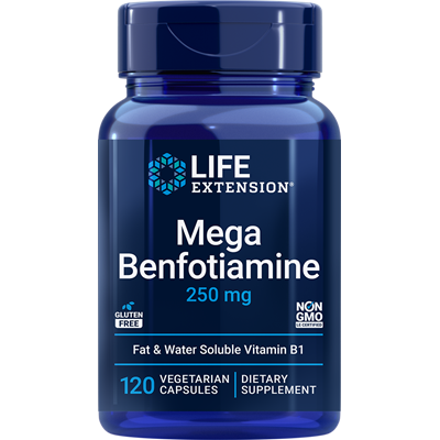 Mega Benfotiamine is formulated with 250 mg of benfotiamine and 10 mg of thiamine (vitamin B1) to support healthy blood sugar metabolism. It also helps protect your body against oxidative stress and glycation, a biochemical reaction that can contribute to a variety of age-related factors.