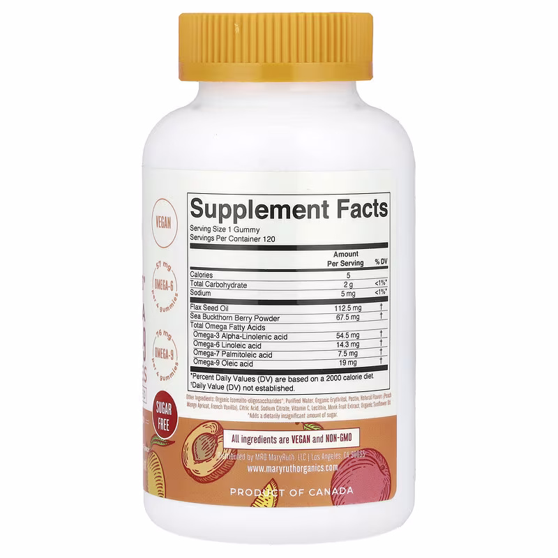 Our Omega 3-6-7-9 Gummies are made with vegan omega fatty acids, derived from: organic flaxseed oil (112.5 mg per gummy) and organic SeaBerry® (67.5 mg per gummy)!