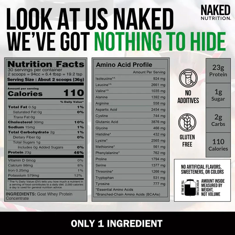 Naked Goat has only one ingredient: Goat whey protein sourced from pasture-raised goats on small-herd Wisconsin dairies. We use cold processing to create non-denatured goat whey so you get clean protein loaded with essential amino acids and other beneficial nutrients.