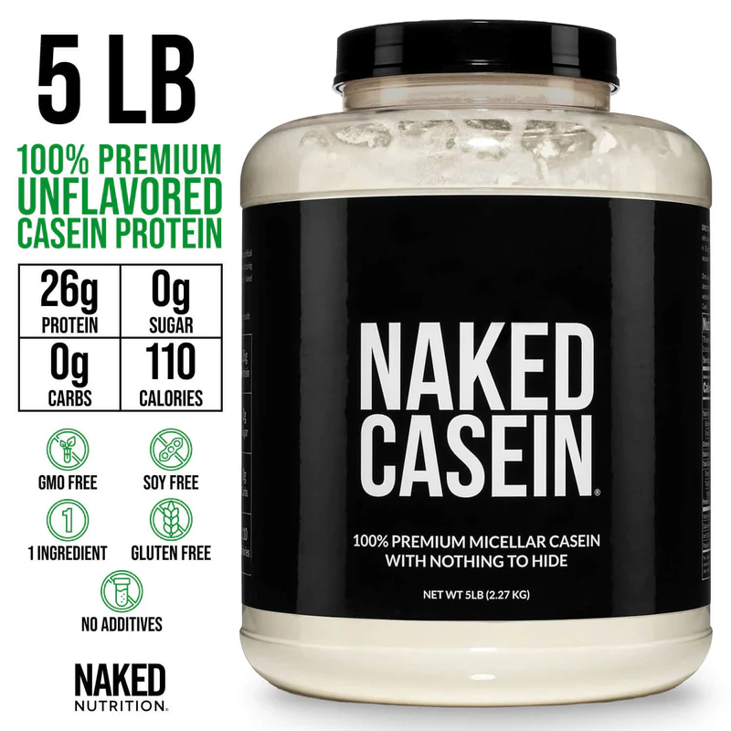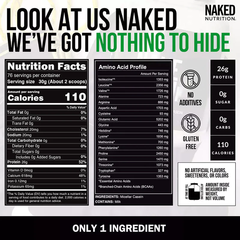 Naked Casein has only one ingredient: Micellar casein sourced from US farms. Casein is a slow-digesting protein that helps you stay full for longer. When taken before bed, casein protein supports the muscle recovery process throughout the night.
