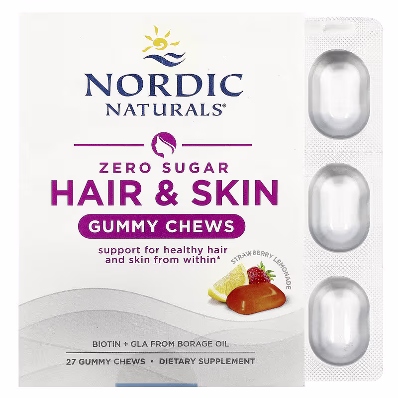 Hair & Skin Gummy Chews combine essential vitamin B7 (biotin) with highly concentrated gamma-linolenic acid (GLA) from borage seed oil to provide research-backed support for healthy skin and hair.