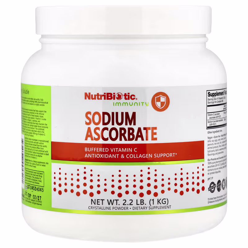NutriBiotic® Sodium Ascorbate is a non-bitter, non-acidic, fully reacted, buffered crystalline powder combining 100% pharmaceutical grade vitamin C (L-ascorbic acid) and sodium in a highly soluble form.