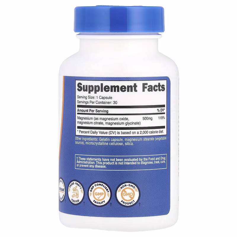 Magnesium (as magnesium oxide, magnesium citrate, magnesium glycinate) 500 mg 119%