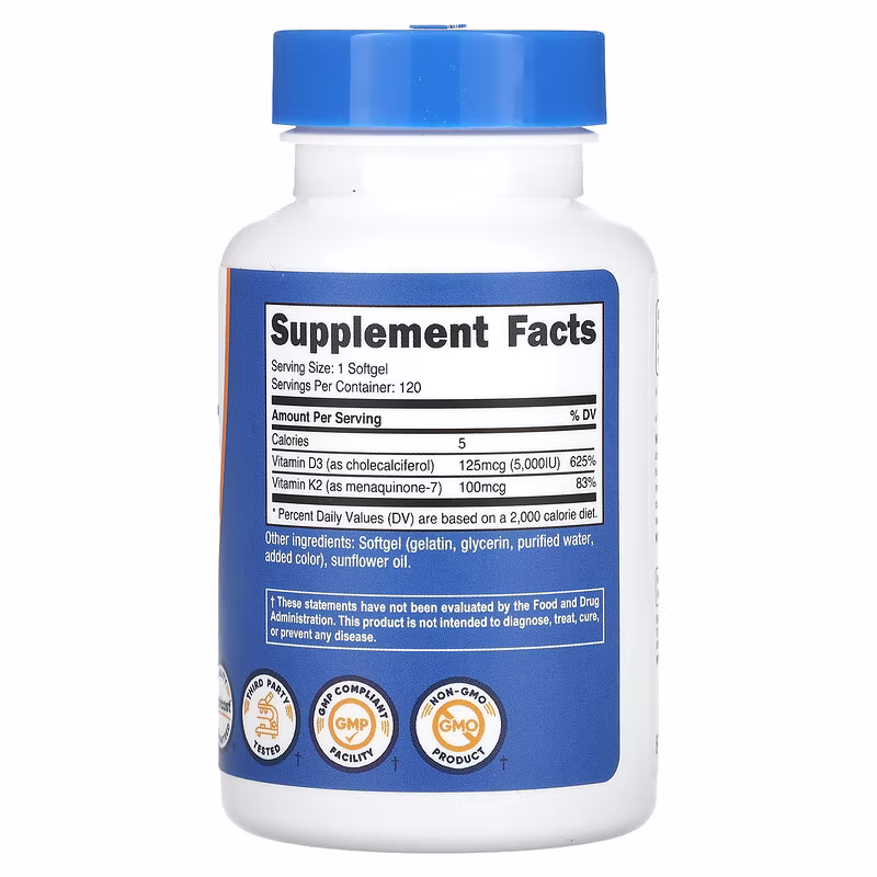 Assists in the activation of the Matrix GLA, a protein that aids in preventing calcium buildup. 100 mcg of Vitamin K2 (mk7) and 5000 IU of Vitamin D3 in every serving.