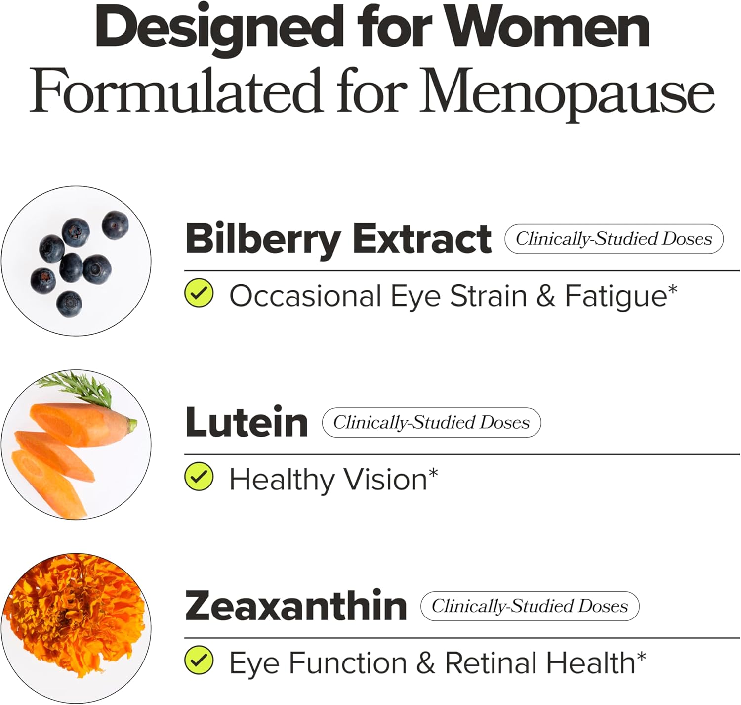 - Science-Backed Ingredients: MENO Eye Health contains clinically-studied doses of lutein, zeaxanthin, and bilberry extract to support healthy vision, eye function, retinal health, healthy tear production, and occasional eye strain & fatigue.*