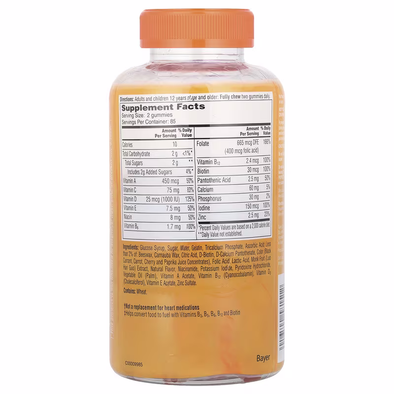 Glucose syrup, sugar, water, gelatin, tricalcium phosphate, ascorbic acid; Less than 2% of: Beeswax, carnauba wax, citric acid, d-biotin, d-calcium pantothenate, color (black currant, carrot, cherry and paprika juice concentrates), folic acid, lactic acid, monk fruit (luo han guo) extract, natural flavor, niacinamide, potassium iodide, pyridoxine hydrochloride, vegetable oil (palm), vitamin A acetate, vitamin B12 (cyanocobalamin), vitamin D3 (cholecalciferol), vitamin E acetate, zinc sulfate.