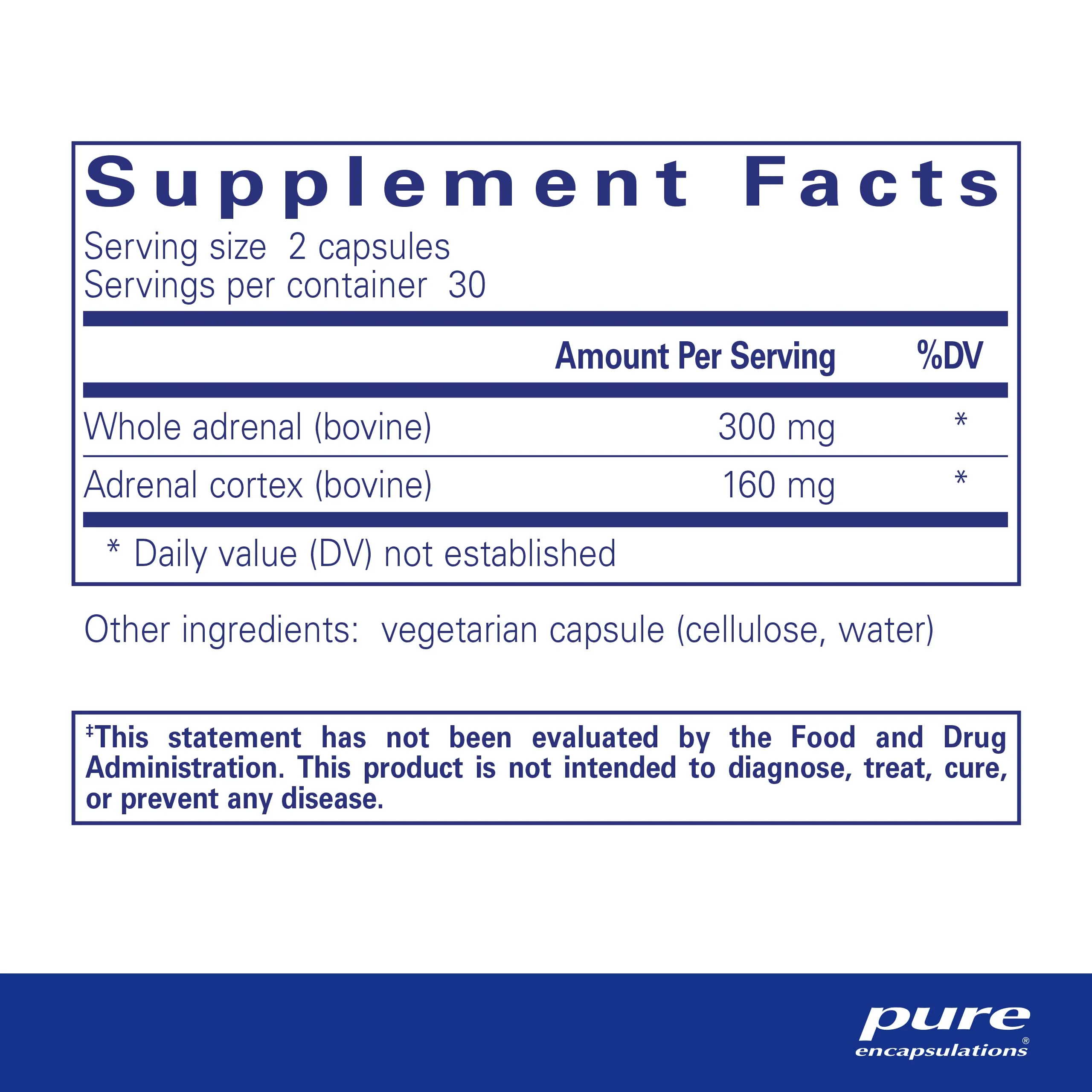The Adrenal supplement offers a blend of whole adrenal and adrenal cortex to help maintain adrenal gland function and healthy cortisol levels. Whole adrenal and adrenal cortex nutritionally support the adrenal gland.‡