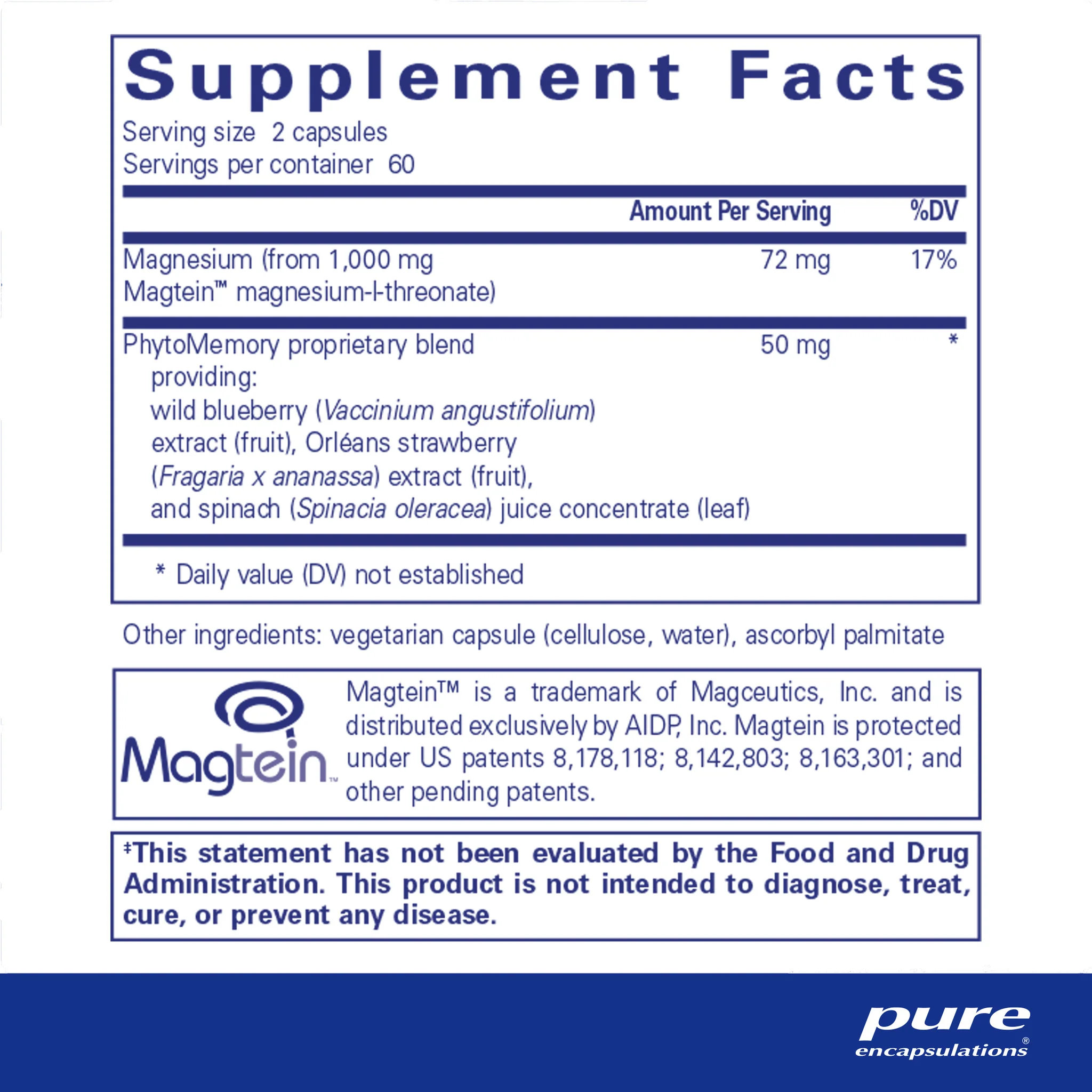Animal research suggests the magnesium-l-threonate in this formula may promote learning and memory. In a clinical trial of 44 participants aged 50-70, Magtein® magnesium l-threonate provided significant support for cognitive processing speed, executive function and overall cognitive ability after only 6 weeks. An in vitro study demonstrated the PhytoMemory blend of wild blueberry, Orléans strawberry and spinach extracts maintained healthy activity of an important protein called prolyl endopeptidase, involved in learning and memory. In clinical studies, consumption of blueberries, strawberries and spinach has been associated with brain health.‡