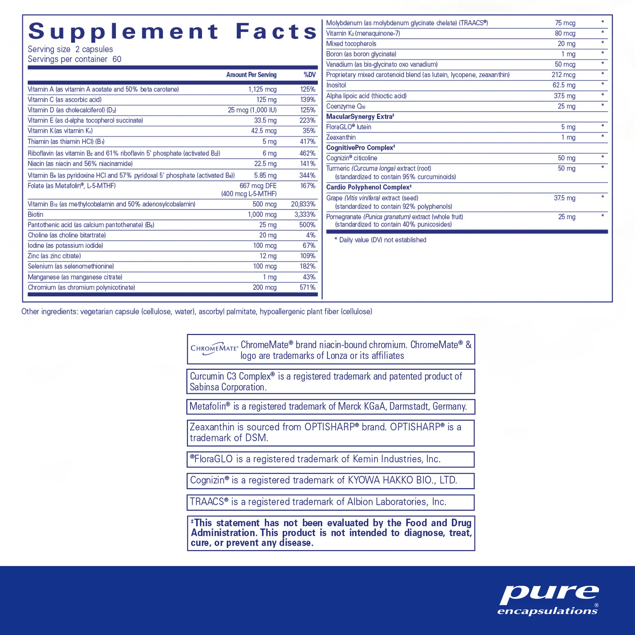 This supplement contains vitamins K1 and K2 and vitamin D3 for optimal bone and heart health. CardioPhenol Complex maintains healthy blood vessel function with antioxidants from pomegranate and grape seed extract. MacularSynergy Extra promotes advanced macular and retinal protection with lutein and zeaxanthin. Synergistic cofactors include vitamin C, vitamin E, zinc and carotenoids.‡