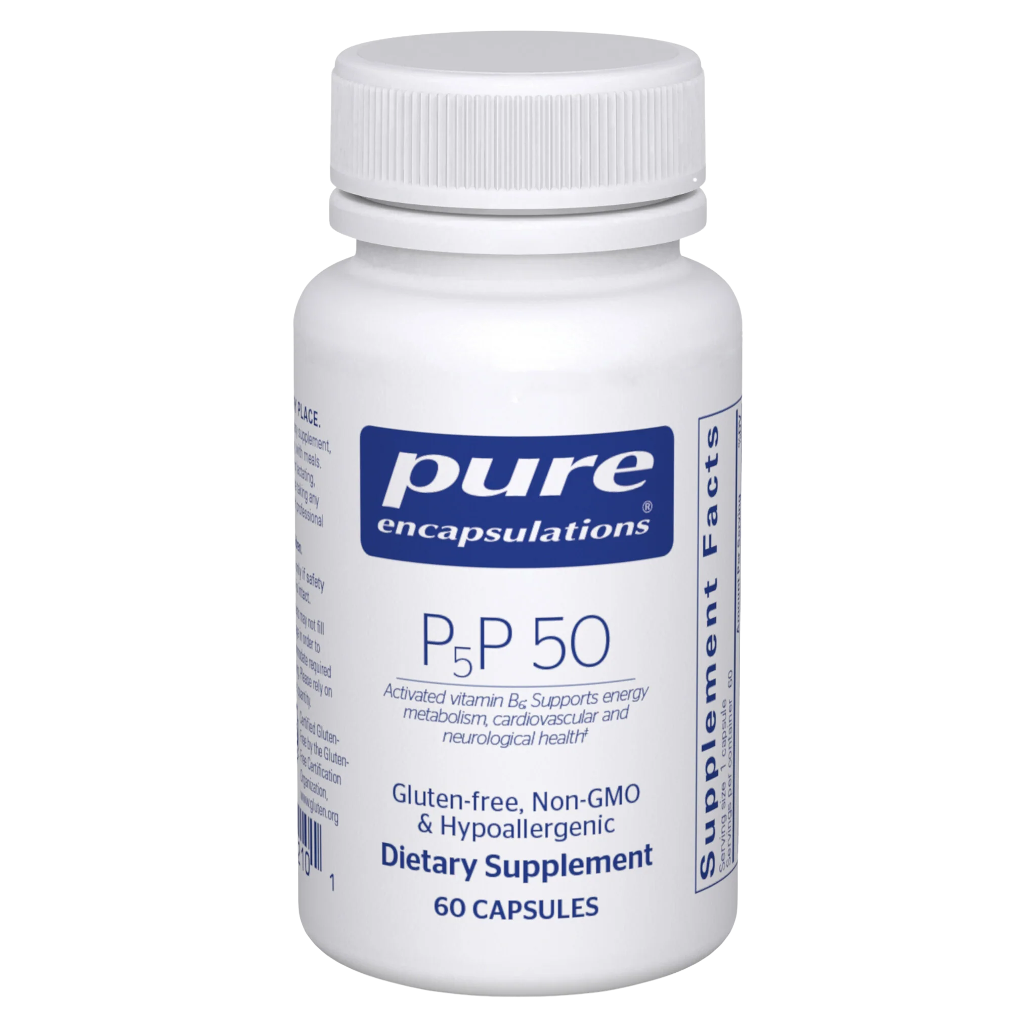P5P 50 is the activated and essential vitamin B6 (as pyridoxal 5 phosphate) and supports heart and brain health. It also helps break down carbs, fats and proteins while providing a range of physiological support throughout the body, including helping with the production of antibodies and red blood cells.‡