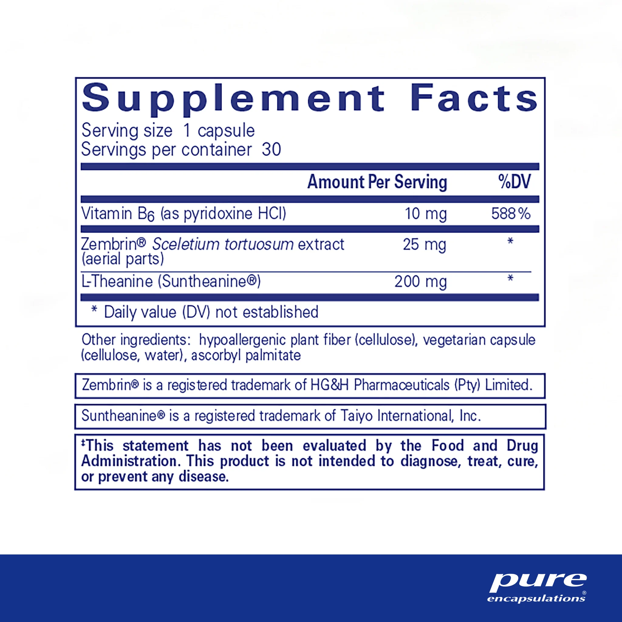 In a clinical trial, a single dose of 25 mg Zembrin® reduced perceived levels of occasional anxiety and its physical symptoms, such as elevated heart rate, in healthy volunteers, within 1 hour.¹  In another randomized clinical trial, a single 25 mg dose of Zembrin® moderated fear responsivity and activation of the brain’s amygdala, assessed using pharmaco-fMRI.² The amygdala is a part of the brain that reacts to threats and communicates with the rest of the related areas of the brain to regulate feelings of fear and nervousness in threatening situations. In vitro evidence indicates that Zembrin® might work by inhibiting serotonin reuptake, prolonging the effects of serotonin.³ Serotonin is a neurotransmitter involved in relaxation and mood. L- theanine complements Zembrin® by supporting a relaxed and alert mental state.⁴ Vitamin B6 is a cofactor in the biosynthesis of serotonin.⁵ This formula is ideal for as-needed relief from occasional everyday stressors.‡