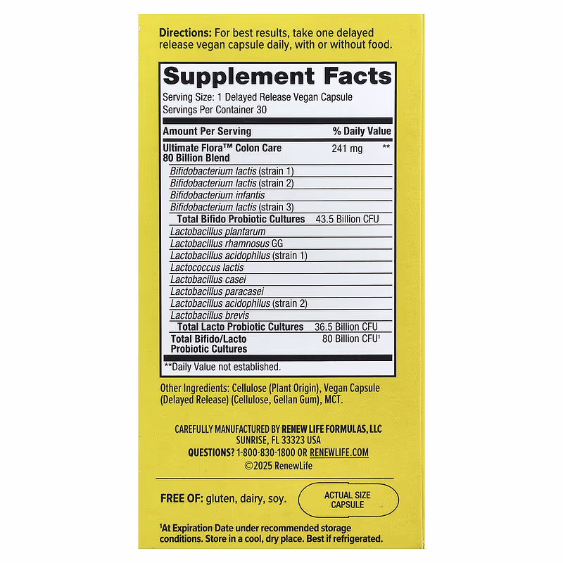 | Ultimate Floraâ„¢ Colon Care 80 Billion Blend Bifido Probiotic Blend Bifidobacterium lactis (strain 1) Bifidobacterium lactis (strain 2) Bifidobacterium infants Bifidobacterium lactis (strain 3) |