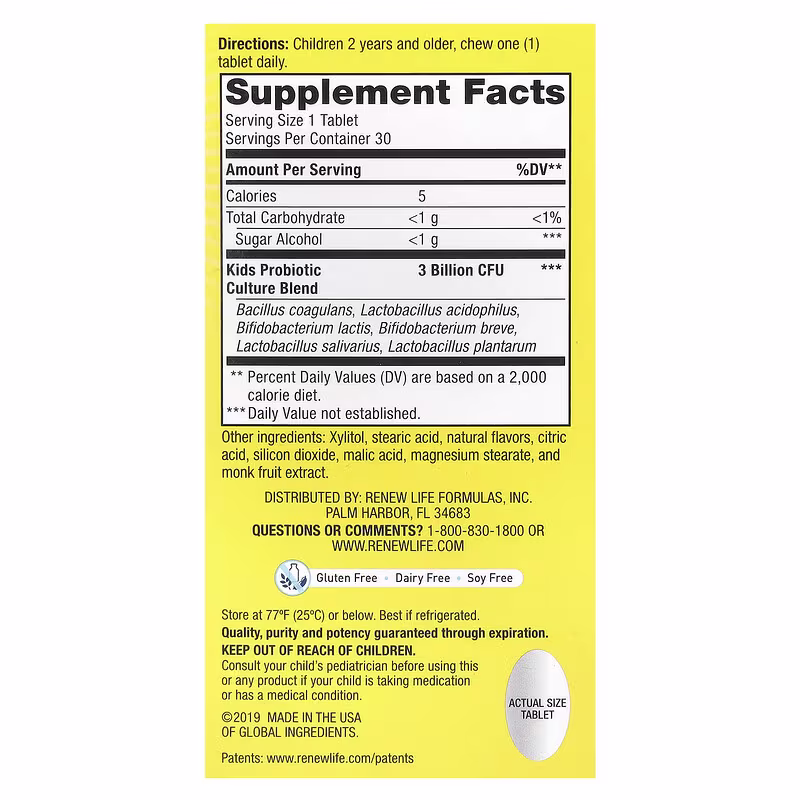 | Kids Probiotic Culture Blend Bacillus coagulans, Lactobacillus acidophilus, Bifidobacterium lactis, Bifidobacterium breve, Lactobacillus salivarius, Lactobacillus plantarum |