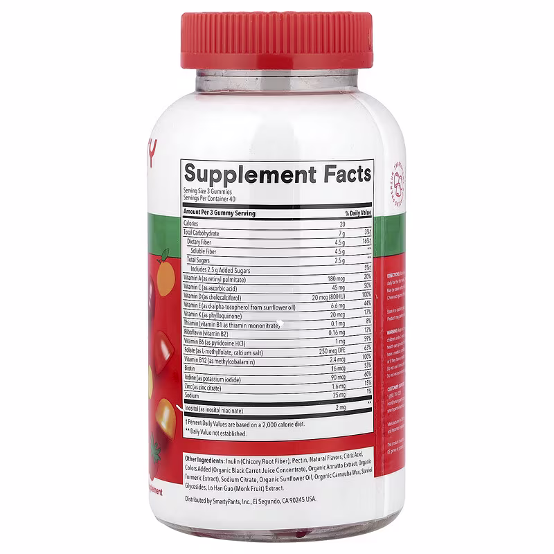 SmartyPants’ Kids Multi & Fibre gummies for kids are formulated with over 15 nutrients including omega-3 EPA and DHA essential fatty acids and dietary fibre. Designed to support digestion, bone health, the immune system, and more — all in one delicious non-GMO formula.