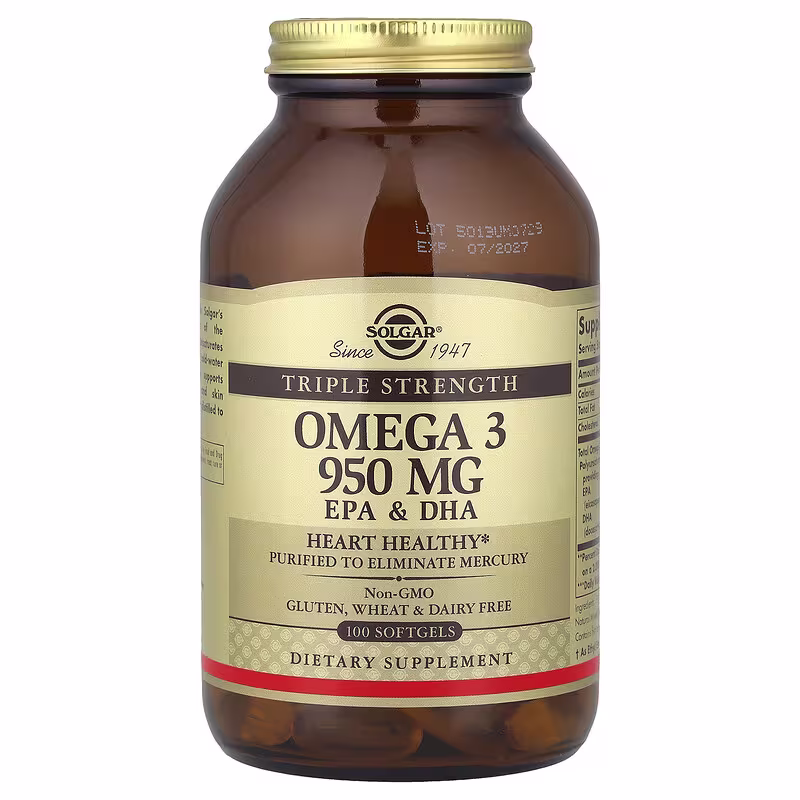 Omega 3 950 mg is Solgar’s highest concentration of the natural Omega 3 polyunsaturates EPA and DHA from cold-water fish. This formulation supports cardiovascular, joint and skin health. It is molecularly distilled to remove mercury.