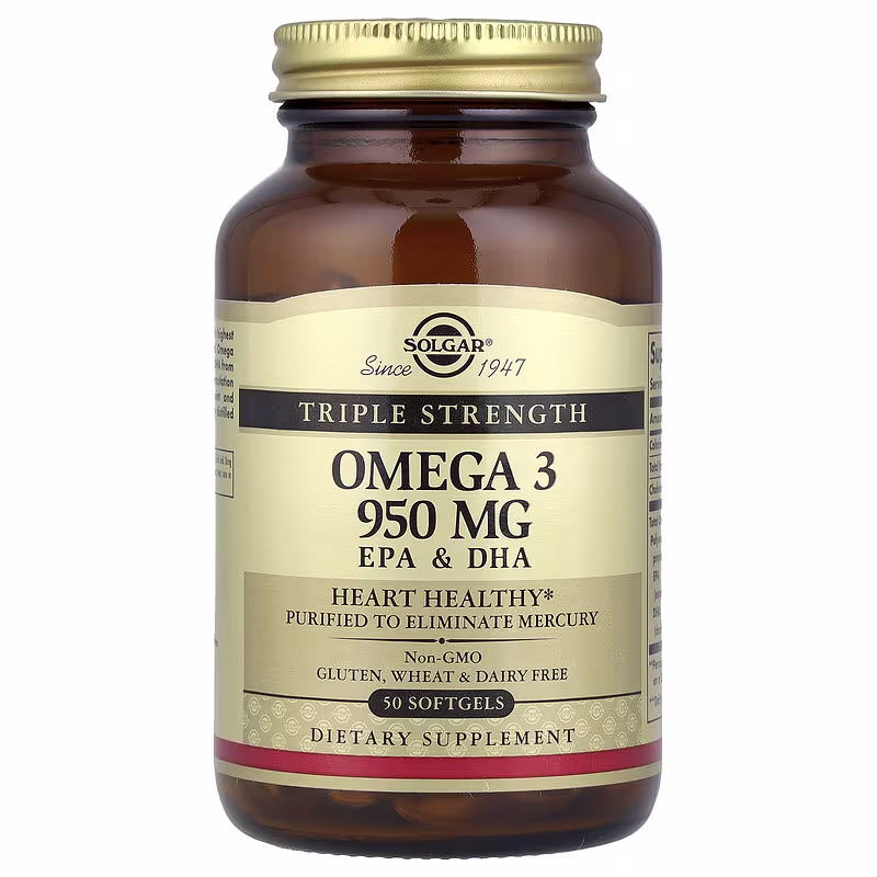 Omega 3 950 mg is Solgar’s highest concentration of the natural Omega 3 polyunsaturates EPA and DHA from cold-water fish. This formulation supports cardiovascular, joint and skin health. It is molecularly distilled to remove mercury.