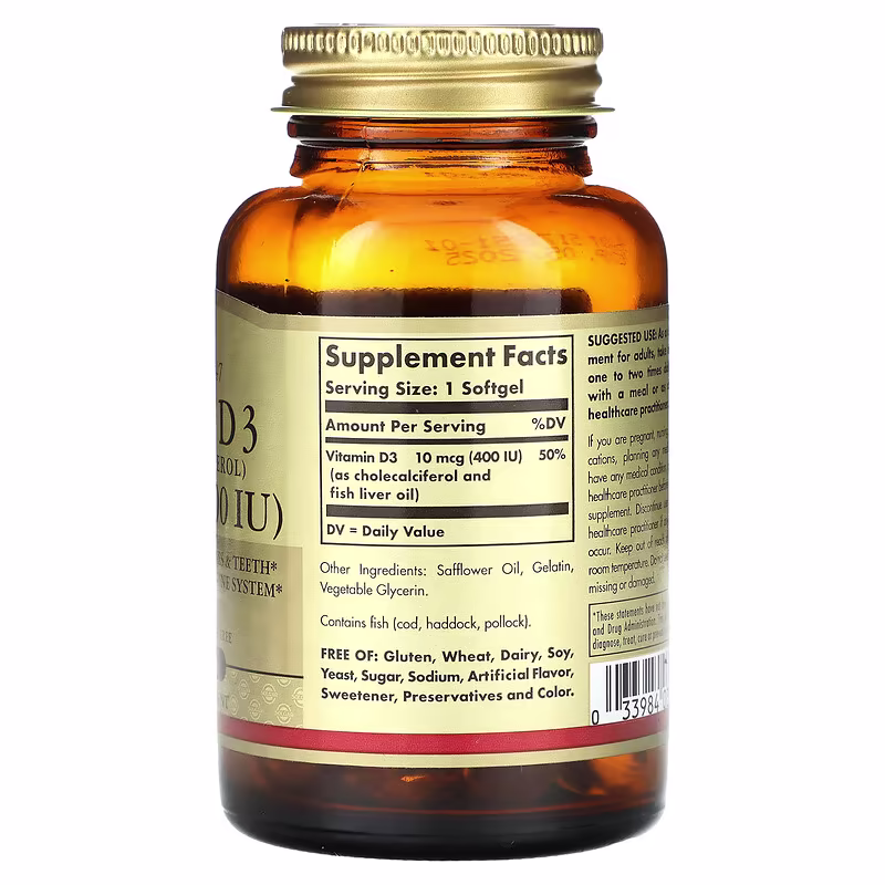 | Vitamin D3 (as cholecalciferol and fish liver oil) | 10 mcg (400 IU) | 50% |