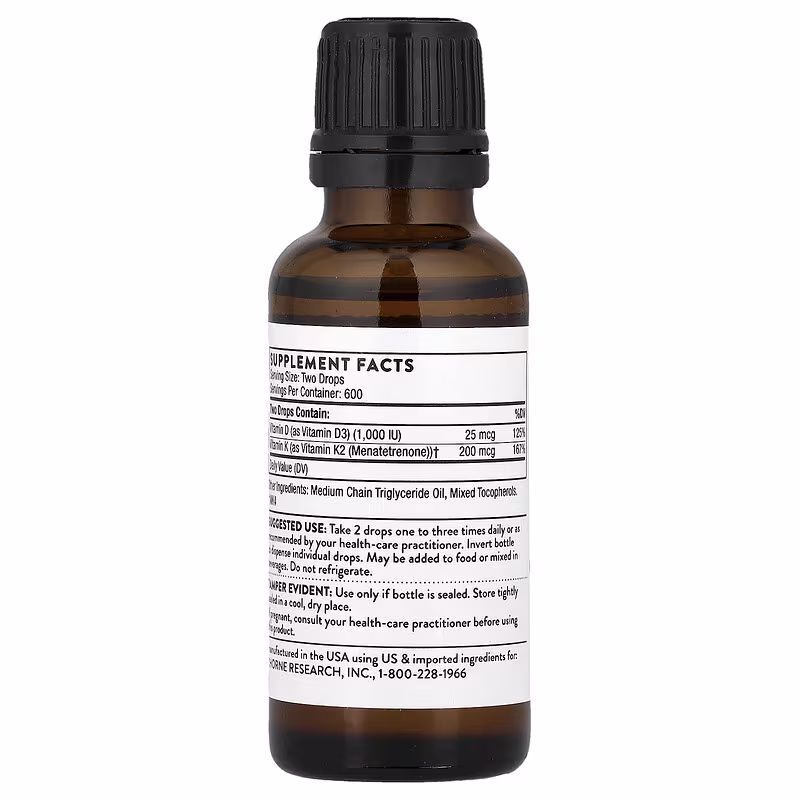 Vitamin D + K2 Liquid promotes bone health, healthy immune function, and cardiovascular health. The combination of vitamin D3 and K2 provides greater benefits together than either does individually.