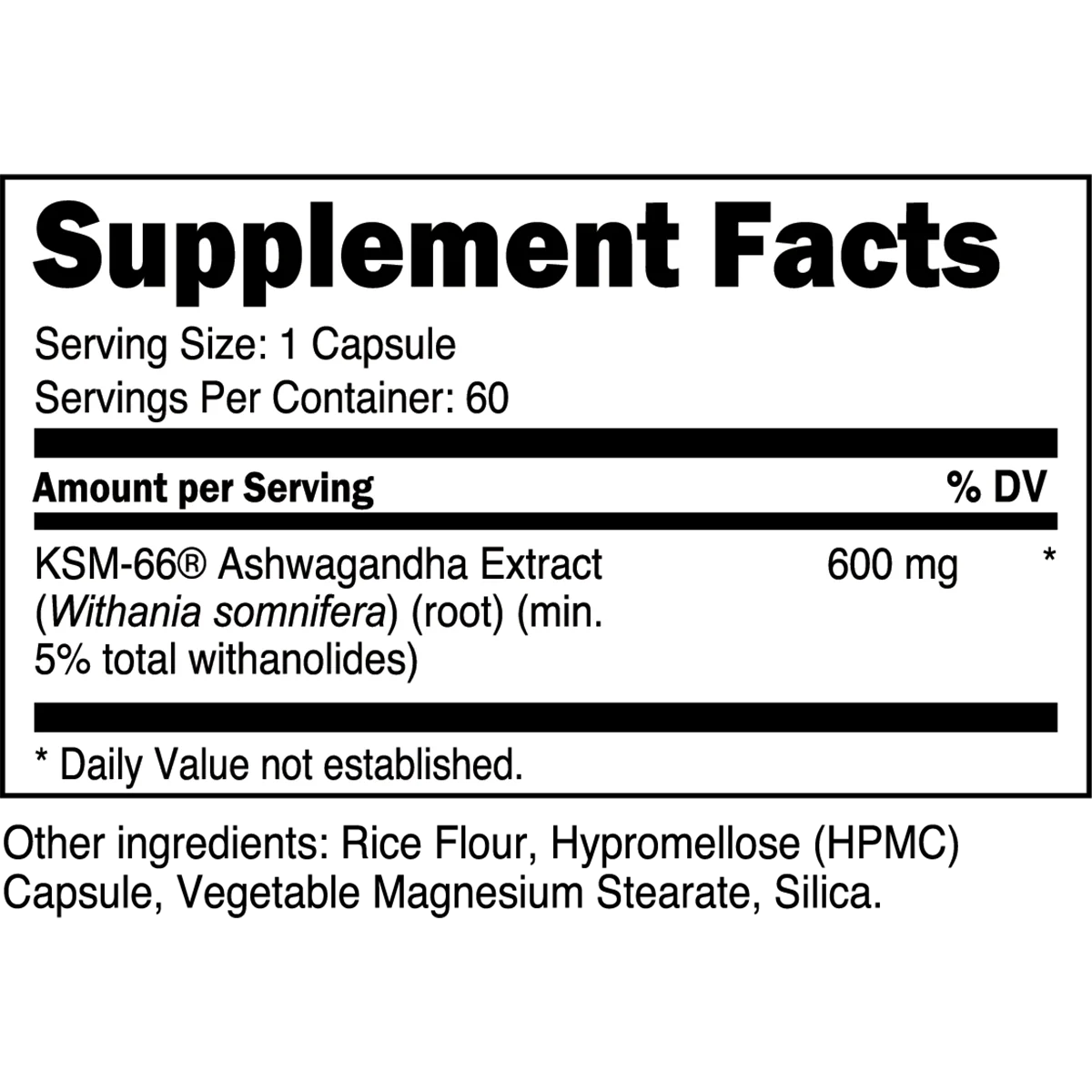 Each capsule provides the clinically studied dose of 600 mg KSM-66®, which is the most extensively studied ashwagandha extract available, standardized to contain 5% bioactive withanolides.